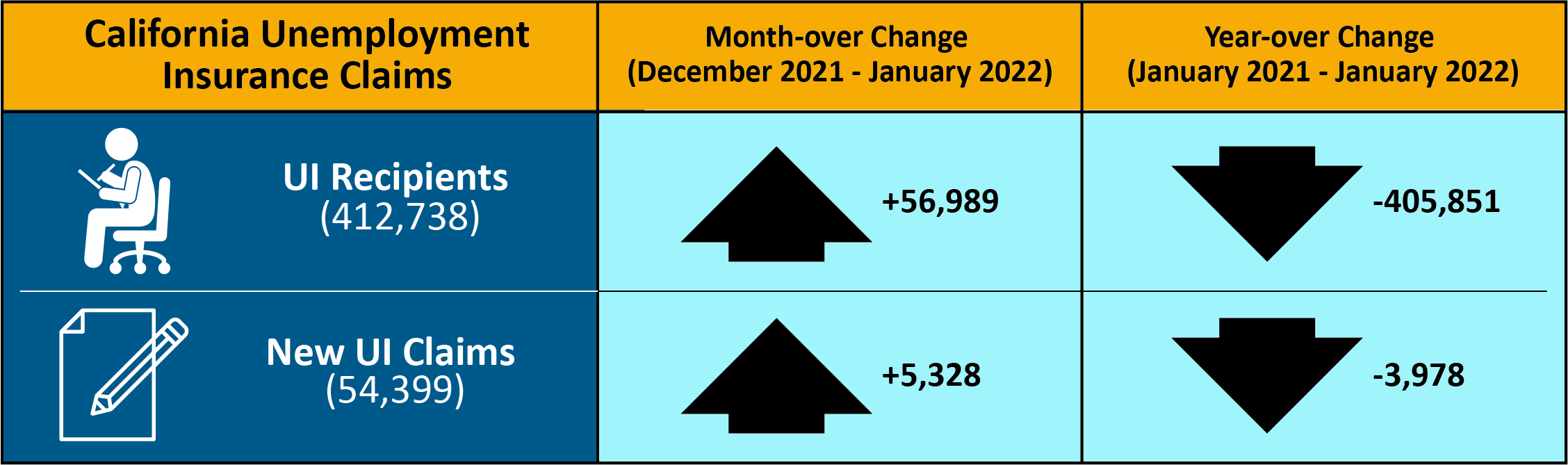 | California Unemployment Insurance Claims | Month-over Change (December 2021–January 2022) | Year-over Change (January 2021–January 2022) |