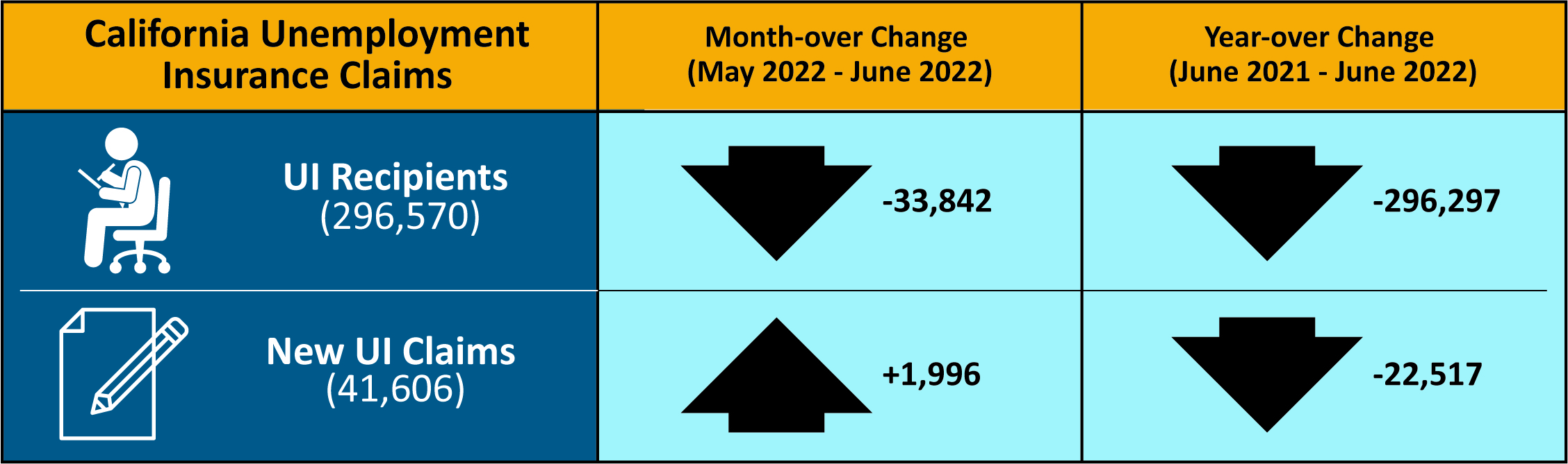 | California Unemployment Insurance Claims | Month-over Change (May 2022–June 2022) | Year-over Change (June 2021–June 2022) |