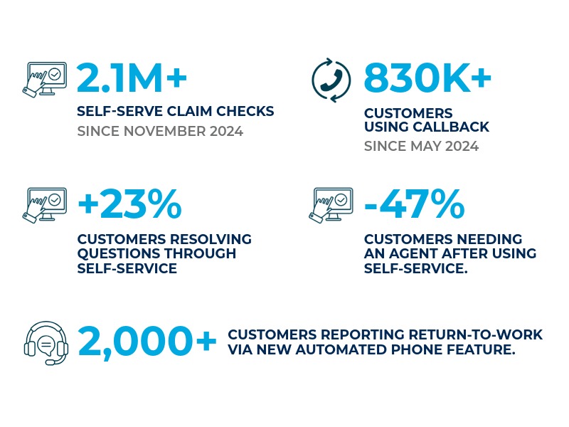 - Automated self-service tools let customers check claim status or payment information instantly. More than 2.1 million customers have used the contact center’s self-serve option to get claim updates since November 2024.